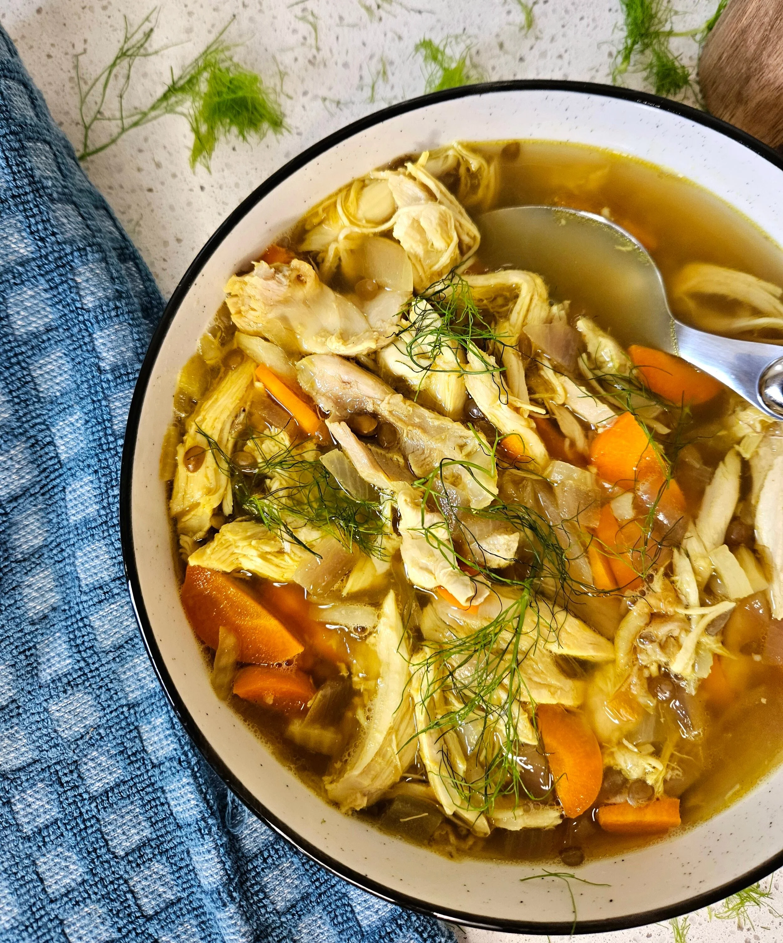 Add 480 grams of shredded cooked chicken breast, 2 carrots (cut into half moons), and 200 grams of rinsed and drained lentils to the pot.